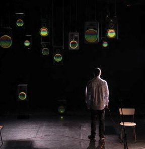 Sur scène, aux côtés de Maky, c’est Fabrice Blin alias Fabot, artiste multimédia, tant illustrateur graphique que sonore, qui sculpte l’espace sonore. La scénographie de Patricia Saive donne directement le ton : un nuée d’enceintes en fond de scène, une table, une chaise et l’imposant matériel électromusical de Fabot. Ce dernier, passionné par le jazz, le funk, le hip-hop s’est largement concentré sur le turntablism. Son goût pour la narration le mènera à collaborer avec de nombreux artistes, dont l’auteur et metteur en scène Manuel Antonio Pereira. Venu régulièrement au festival pour ces textes mis en scène ou en lecture, Manuel Antonio Pereira signe là la mise en scène de cet Hymne à l’imperfection après avoir convaincu Maky de théâtraliser son histoire.